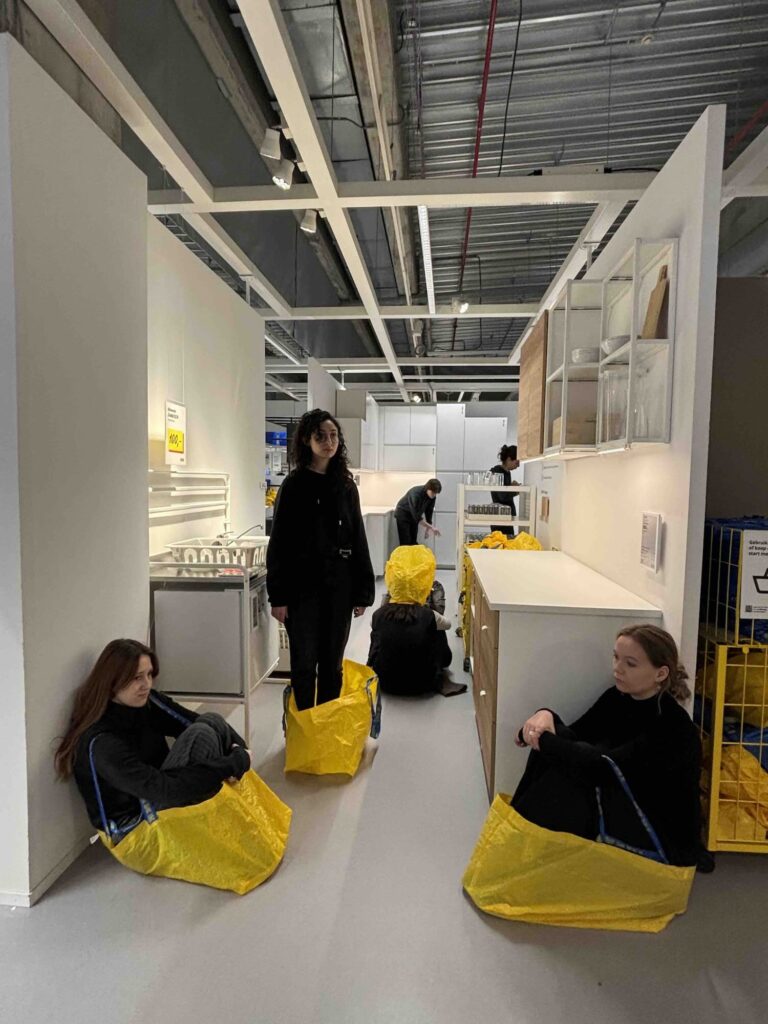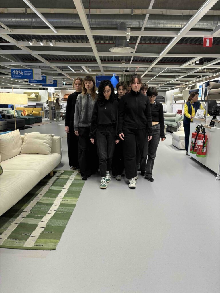 This work is part of the master elective/seminar Too Body to Fail in collaboration with Pieter Ginckels. A group of 22 students from KU Leuven Architecture, LUCA School of Arts Fine Arts, Interior Design and Film entered IKEA Ghent as an unannounced presence. Moving through the store’s staged domesticity, they activated a series of performative strategies that quietly reframed the familiar.