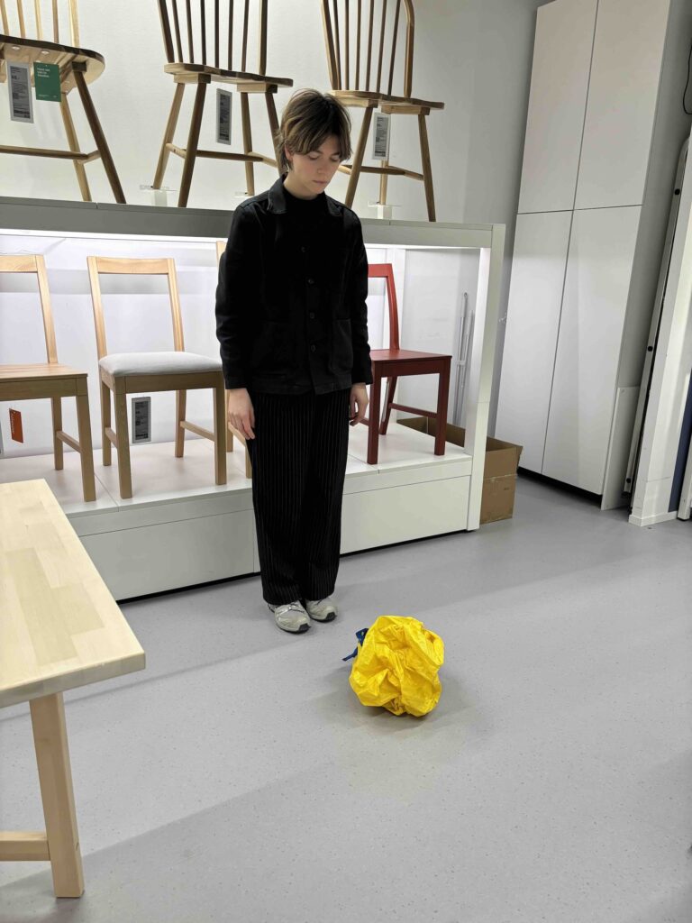 Walking in a flock, they navigated the showroom floors as a collective body. Through action words and scores, they engaged with the store’s objects not as commodities but as material for attention. Each student chose an everyday object, a chair, a cup, a key, and spent time with it differently: noticing its weight, texture, balance, and sound; exploring how it transformed through holding, balancing, passing, or stillness; attending to what shifted when a gesture was repeated or a context altered. As in the work of Marie Cool & Fabio Balducci, the approach favored precision and economy over theatricality. The object remained recognizable, yet became strange.