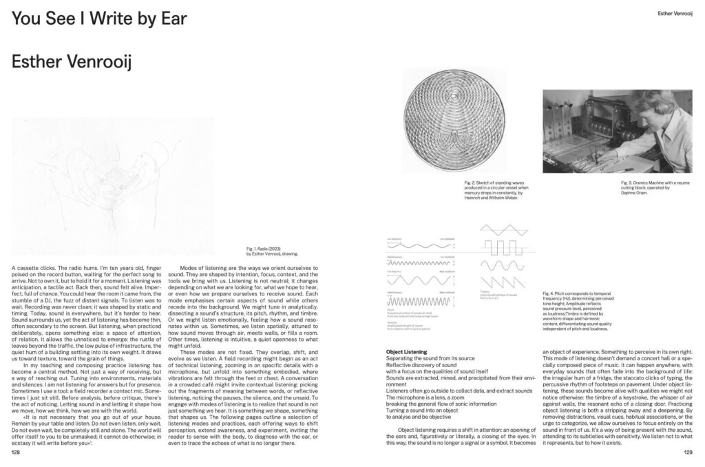 “You See I Write by Ear” I explore listening as an active, multifaceted practice. Moving through selected modes of listening: object, semantic, causal, expanded, and musical listening. The essay proposes that how we listen shapes how we understand space, sound, and the world around us. These are not fixed categories but temporary lenses, shifting as quickly as our attention does.